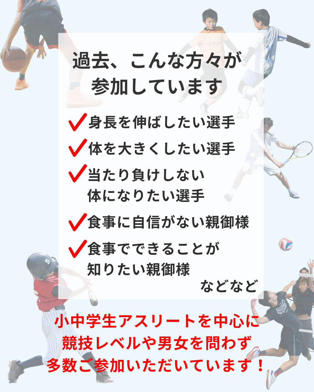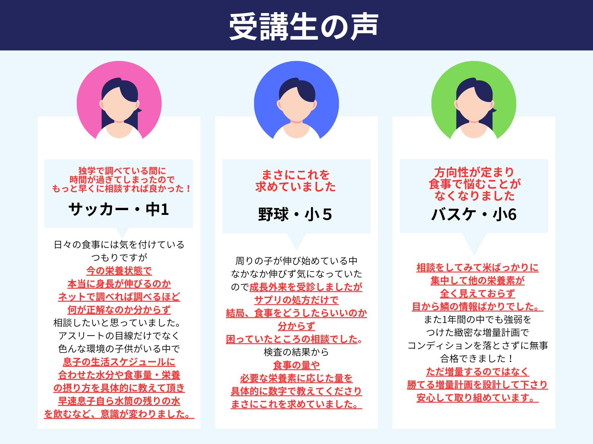 同じようなお悩みを持つ保護者の方や選手たちが