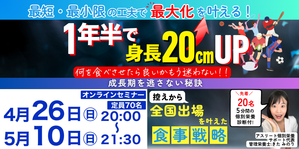 こんにちは! アスリート個別栄養サポートの きたみのりです! ついに!!! 6月に開催し、満員御礼と大好評だった あのセミナーが帰ってきます! 今回のテーマは… ============= 『身長を伸ばすための食事』 ~ …